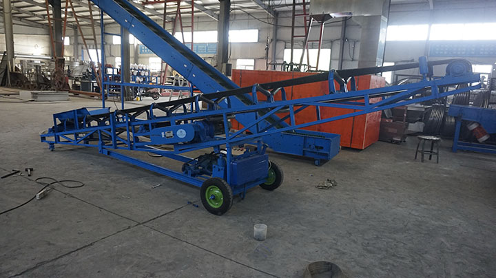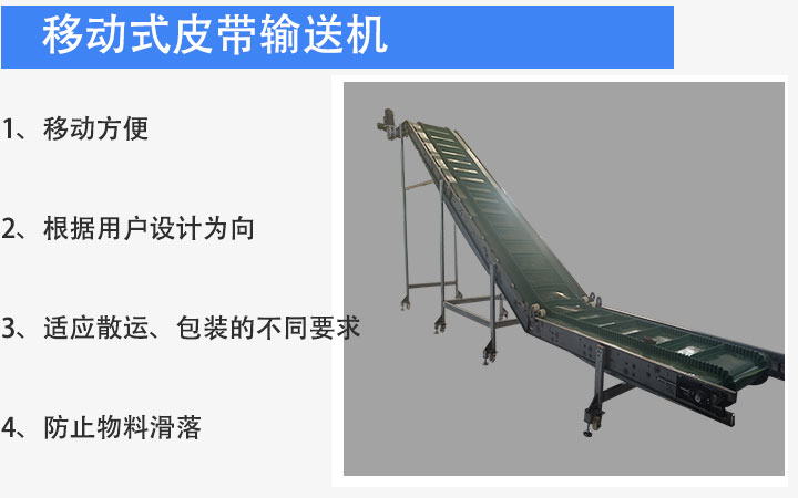 移動式皮帶輸送機是在普通皮帶輸送機底部加裝了移動輪、充氣輪胎、滑動輪,可以根據物料的堆放位置隨意移動,人工即可推動出入倉庫,主要用于裝卸地方變動的場合。