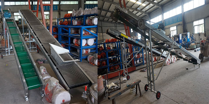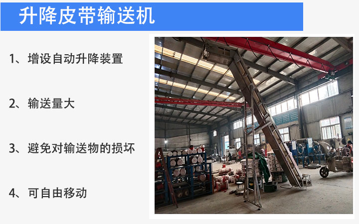 升降皮帶輸送機即移動液壓升降式皮帶輸送機,增設自動升降裝置,可以自由調整高度,適用于散狀物料或成件物品的短途輸送和裝卸工作,并配有充氣輪胎和鋼輪兩種行走輪,機長10米以上傾角可調。